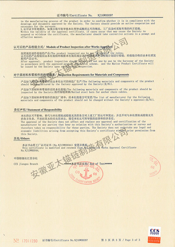 安徽亞太錨鏈制造有限公司是國家高新技術企業,也是國家GB/T 549-2017《電焊錨鏈》標準的起草和制定單位之一。公司旗下設有錨鏈分廠、浮標分廠、舾裝件分廠等多個分廠。公司專業從事φ12.5mm-φ107mm二、三級船用錨鏈、浮標錨鏈、錨鏈附件,錨、船舶曬裝產品、航標、系船浮、船型標、多種規(guī)格海洋監(jiān)測浮標及航標燈等產品的生產、安裝和服務。目前公司的產品銷往全國各地船廠、碼頭、航標處、航道局、海洋局,并已走上國際市場,如東南亞、中東、歐美等國家。